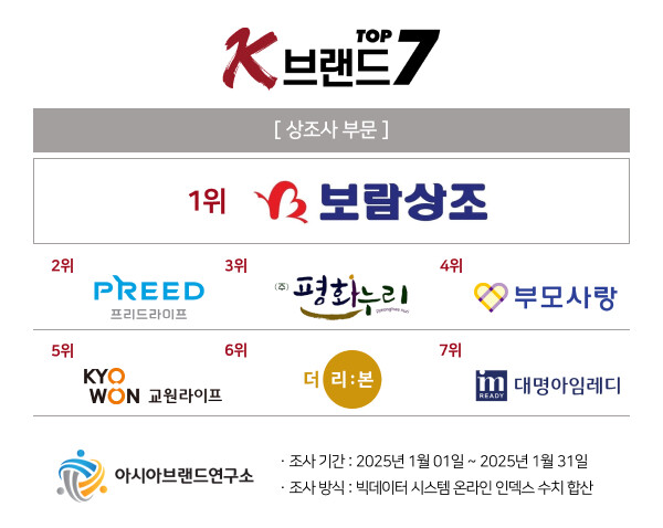 아시아브랜드연구소 - ‘K-브랜드 톱7’ 상조사 순위는?...‘1위 보람상조 vs 2위 프리드라이프’ 선두 경쟁