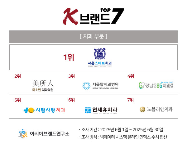 이번 ‘K-브랜드 톱7’ 치과 부문은 서울스마트치과의원이 1위를 차지했으며, 2위 미소인치과의원, 3위 서울탑치과병원, 4위 강남365치과의원, 5위 사람사랑치과의원, 6위 연세휴치과의원, 7위 노블리안치과의원 등이 이름을 올렸다.
