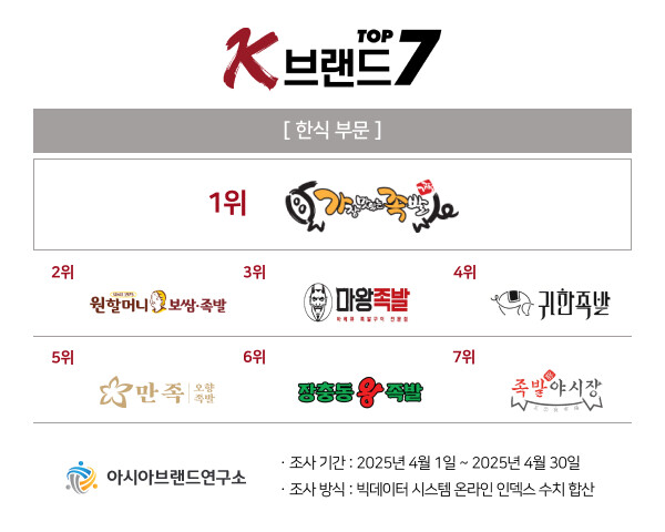 ‘K-브랜드 톱7’ 한식 부문은 가장맛있는족발이 1위의 영예를 차지한 가운데, 2위 원할머니보쌈, 3위 마왕족발, 4위 귀한족발, 5위 만족오향족발, 6위 장충동왕족발, 7위 족발야시장 등이 이름을 올렸다.