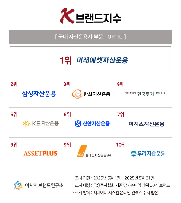 아시아브랜드연구소, ‘K-브랜드지수’ 자산운용사 순위 발표...‘미래에셋자산운용' 1위 영예