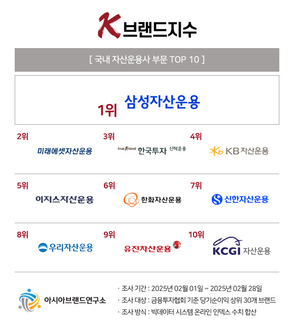 빅데이터 평가 기관인 아시아브랜드연구소는 'K-브랜드지수' 자산운용사 부문 1위에 삼성자산운용이 선정됐다고 14일 발표했다.