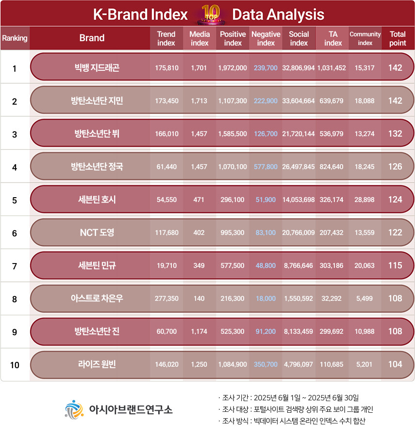 이번 K-브랜드지수 보이 그룹 개인 부문은 포털사이트 검색량 상위 주요 보이 그룹 개인를 대상으로, 2025년 6월 1일부터 6월 30일까지의 온라인 빅데이터 2억 2732만 3354건을 분석했다.