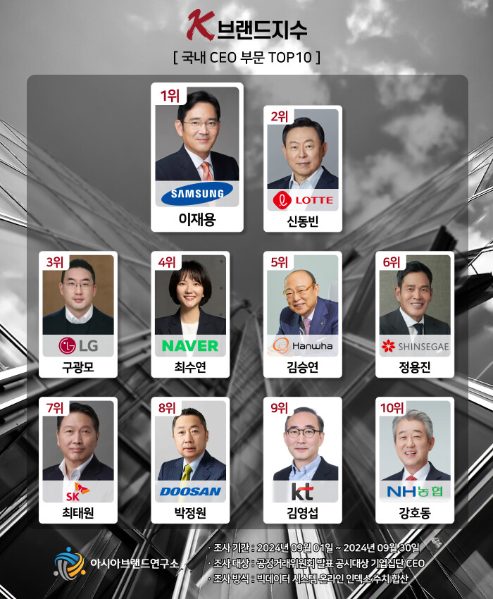 이재용 삼성전자 회장이 또 다시 1위를 수성한 K-브랜드지수 CEO 부문은 신동빈(롯데), 구광모(LG), 최수연(네이버), 김승연(한화), 정용진(신세계), 최태원(SK), 박정원(두산), 김영섭(KT), 강호동(농협) 등이 TOP10의 영예를 차지했다.