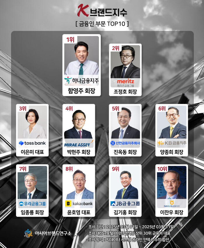 이번 K-브랜드지수 금융인 부문은 포털사이트 검색량 상위 30위 금융사 대표를 대상으로, 2025년 3월 1일부터 3월 31일까지의 온라인 빅데이터 1708만 1972건을 분석했다.