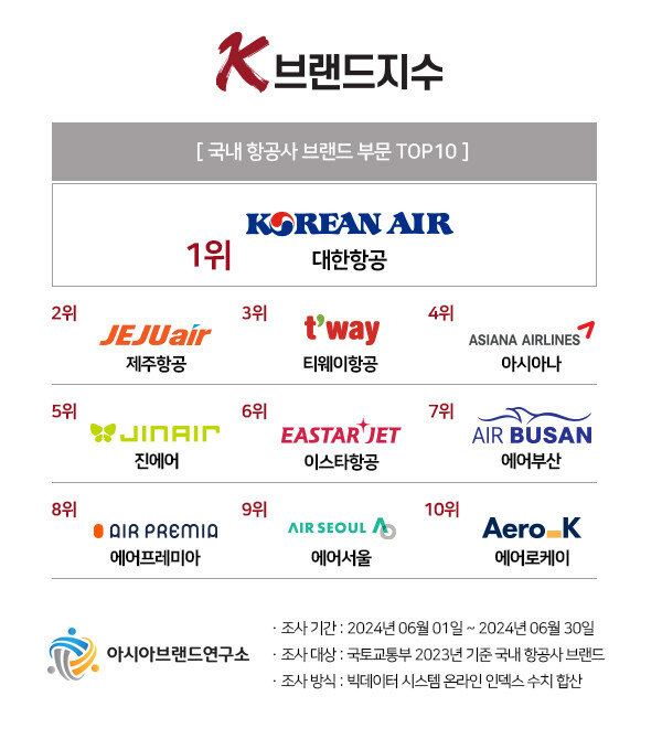 K-브랜드지수 항공사 부문은 대한항공이 1위에 등극한 가운데 제주항공(2위), 티웨이항공(3위), 아시아나(4위), 진에어(5위), 이스타항공(6위), 에어부산(7위), 에어프레미아(8위), 에어서울(9위), 에어로케이(10위) 등이 상위권에 이름을 올렸다.