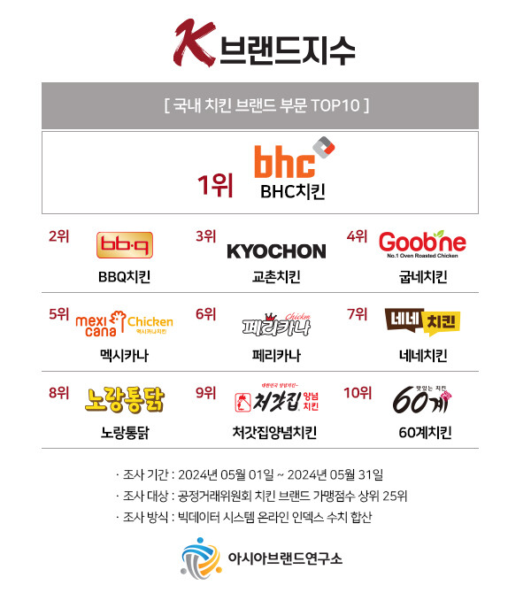 국가대표 브랜드를 표방하는 K-브랜드지수는 아시아브랜드연구소가 국내외 연구진과 협력해 개발한 빅데이터 시스템으로, 이를 기반으로 산출된 치킨 브랜드 부문은 2024년 5월 1일부터 31일까지의 핵심 온라인 빅데이터를 중심으로 분석했다.