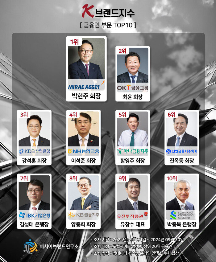 K-브랜드지수 금융인 부문은 박현주(미래에셋그룹 회장)이 1위에 등극한 가운데, 최윤(OK금융그룹 회장), 강석훈(산업은행 회장), 이석준(농협금융지주 회장), 함영주(하나금융지주 회장), 진옥동(신한금융지주 회장), 김성태(IBK기업은행 행장), 양종희(KB금융지주 회장), 유창수(유진증권 대표), 박종복(SC제일은행 행장) 등이 TOP10의 영예를 차지했다.
