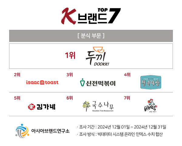 이번 ‘K-브랜드 톱7’ 분식 부문은 두끼가 영예의 1위에 등극했으며, 2위 이삭토스트, 3위 신전떡볶이, 4위 청년다방, 5위 김가네, 6위 국수나무, 7위 배떡 등이 상위권을 차지했다.