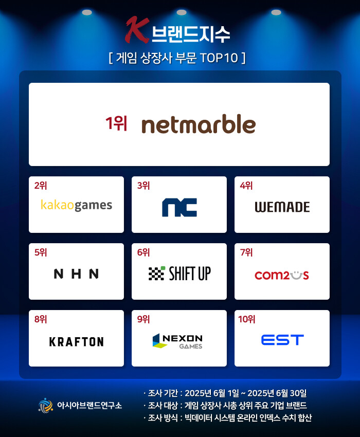 이번 K-브랜드지수 게임 상장사 부문은 게임 상장사 시총 상위 주요 기업을 대상으로, 2025년 6월 1일부터 6월 30일까지의 온라인 빅데이터 551만 7629건을 분석하여 진행됐다.
