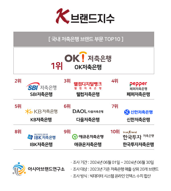 아시아브랜드연구소 - OK저축은행, ‘K-브랜드지수’ 저축은행 부문 1위 등극...SBI-웰컴-페퍼 뒤이어