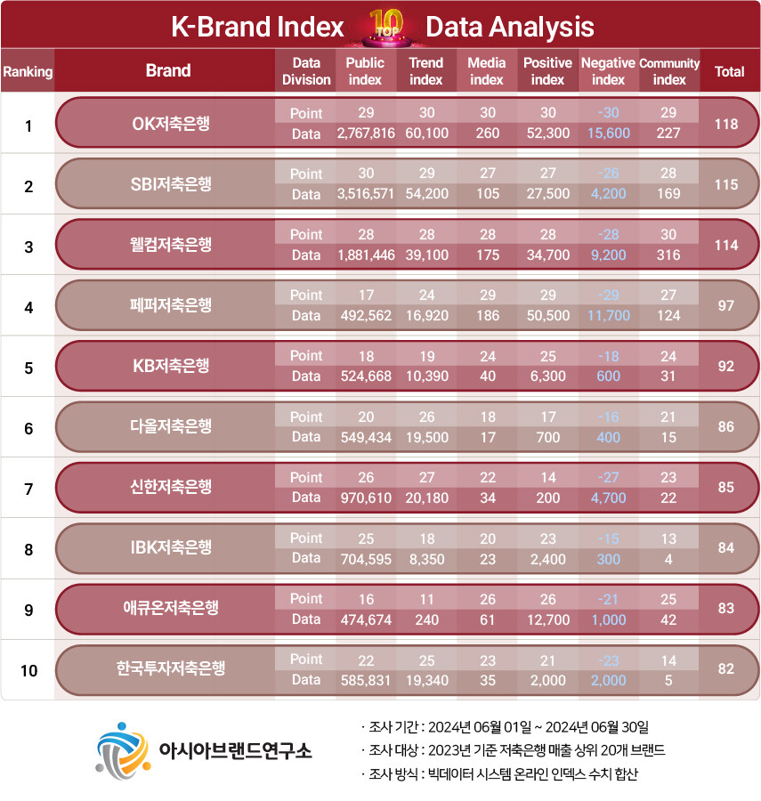 K-브랜드지수 저축은행 부문은 OK저축은행가 1위에 등극한 가운데 SBI저축은행(2위), 웰컴저축은행(3위), 페퍼저축은행(4위), KB저축은행(5위), 다올저축은행(6위), 신한저축은행(7위), IBK저축은행(8위), 애큐온저축은행(9위), 한국투자저축은행(10위) 등이 상위권에 이름을 올렸다.