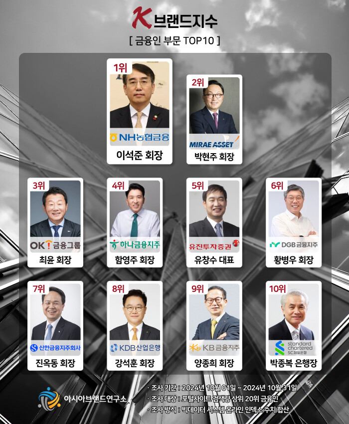 K-브랜드지수 금융인 부문은 이석준(농협금융지주 회장)이 1위에 등극한 가운데, 박현주 회장(미래에셋그룹), 최윤(OK금융그룹 회장), 함영주(하나금융지주 회장), 유창수(유진증권 대표), 황병우(DGB금융그룹 회장), 진옥동(신한금융지주 회장), 강석훈(산업은행 회장), 양종희(KB금융지주 회장), 박종복(SC제일은행 행장) 등이 TOP10의 영예를 차지했다.