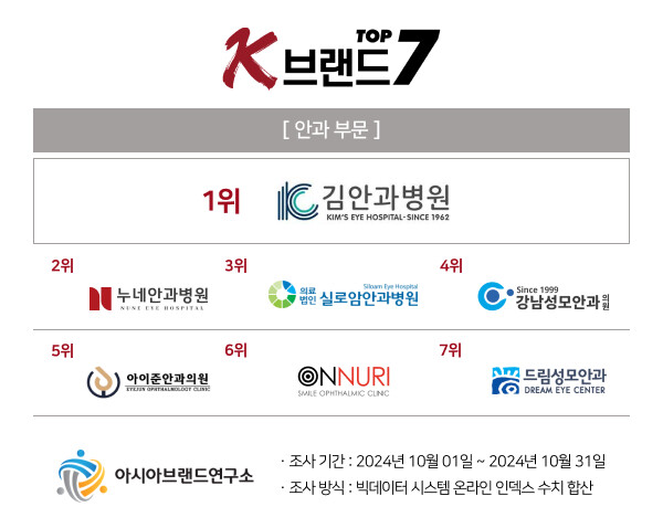 빅데이터 평가 기관인 아시아브랜드연구소는 'K-브랜드 톱7' 안과 부문 1위에 김안과병원이 선정됐다고 6일 발표했다.