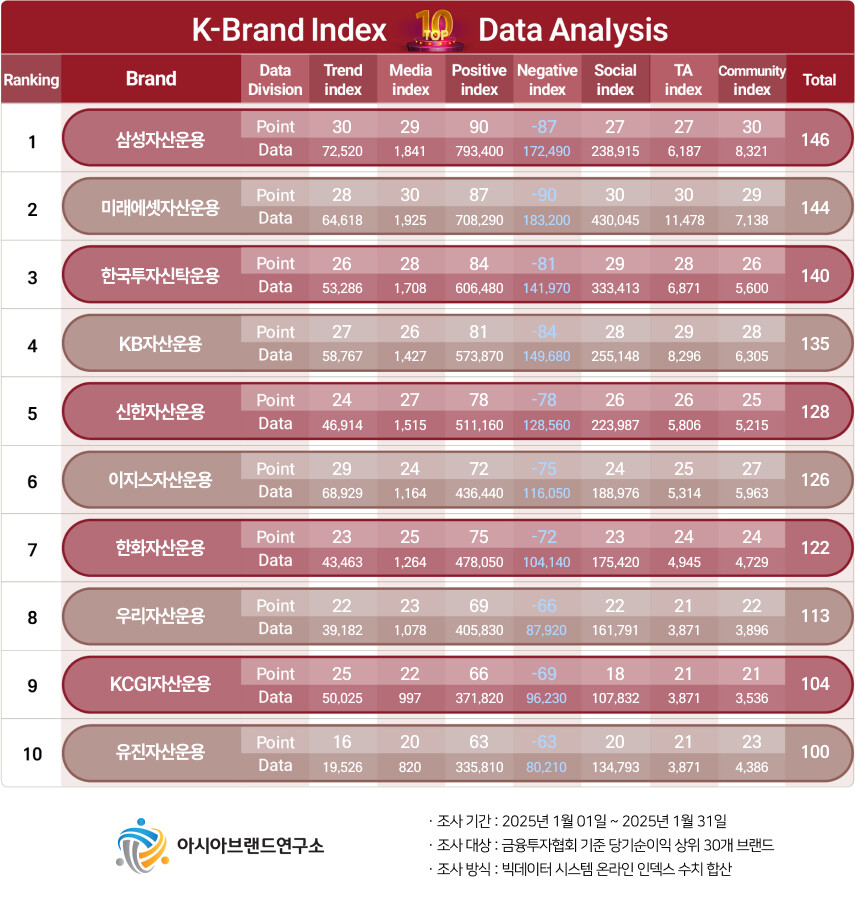 이번 K-브랜드지수 자산운용사 부문은 금융투자협회 기준 당기순이익 상위 30개 브랜드를 대상으로, 2025년 1월 1일부터 1월 31일까지의 온라인 빅데이터 1307만 6698건을 분석했다.