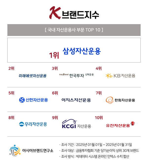 빅데이터 평가 기관인 아시아브랜드연구소는 'K-브랜드지수' 자산운용사 부문 1위에 삼성자산운용이 선정했다고 7일 발표했다.