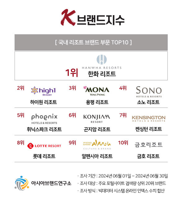 국가대표 브랜드를 표방하는 K-브랜드지수는 아시아브랜드연구소가 국내외 연구진과 협력해 개발한 빅데이터 시스템으로, 이를 기반으로 산출된 리조트 부문은 2024년 6월 1일부터 30일까지의 온라인 빅데이터 12,274,086건을 분석했다.