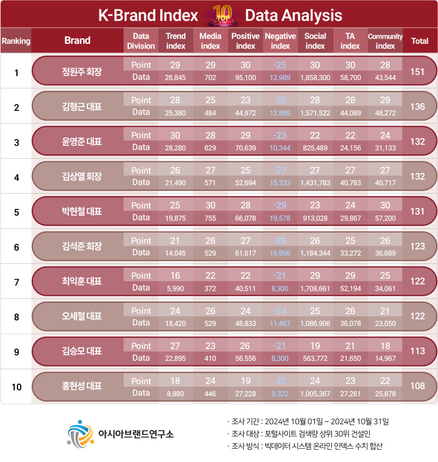 이번 K-브랜드지수 건설인 부문은 포털사이트 검색량 상위 30위에 포함된 국내 금융사의 대표자를 대상으로, 2024년 10월 1일부터 31일까지의 온라인 빅데이터 1913만 7221건을 개별 인덱스에 맞춰 분석했다.
