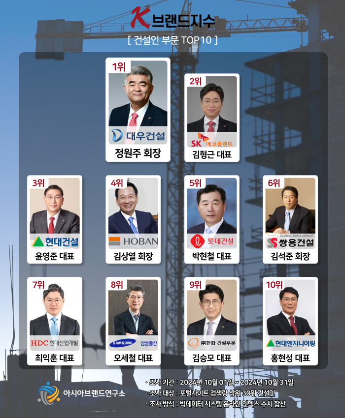 K-브랜드지수 건설인 부문은 정원주(대우건설 회장)가 또 다시 1위에 등극한 가운데, 김형근(SK에코플랜트 대표), 윤영준(현대건설 대표), 김상열(호반건설 회장), 박현철(롯데건설 대표), 김석준(쌍용건설 회장), 최익훈(HDC현대산업개발 대표), 오세철(삼성물산 대표), 김승모(한화 건설부문 대표), 홍현성(현대엔지니어링 대표) 등이 TOP10의 영예를 차지했다.