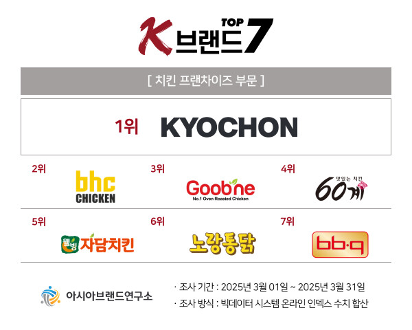 ‘K-브랜드 톱7’ 치킨 프랜차이즈 부문은 2025년 3월 1일부터 31일까지의 온라인 빅데이터 1644만 9377건을 대상으로 조사됐으며, 트렌드(Trend)·소셜(Social)·미디어(Media)·커뮤니티(Community)·긍부정(Positive/Negative) 인덱스 등의 핵심 빅데이터에 대한 가중치 배제 합산 수치로 산출됐다.