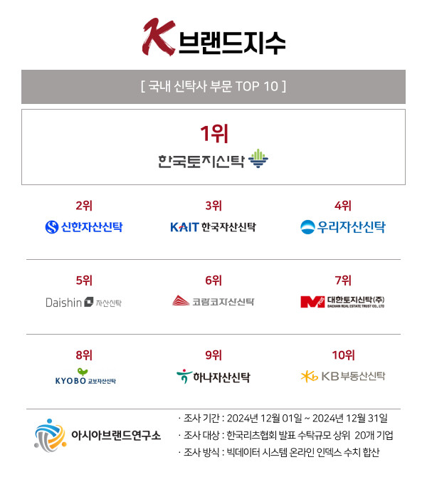 K-브랜드지수 신탁사 부문은 한국토지신탁이 1위를 차지했으며, 신한자산신탁(2위), 한국자산신탁(3위), 우리자산신탁(4위), 대신자산신탁(5위), 코람코자산신탁(6위), 대한토지신탁(7위), 교보자산신탁(8위), 하나자산신탁(9위), KB부동산신탁(10위) 등이 TOP10에 이름을 올렸다.