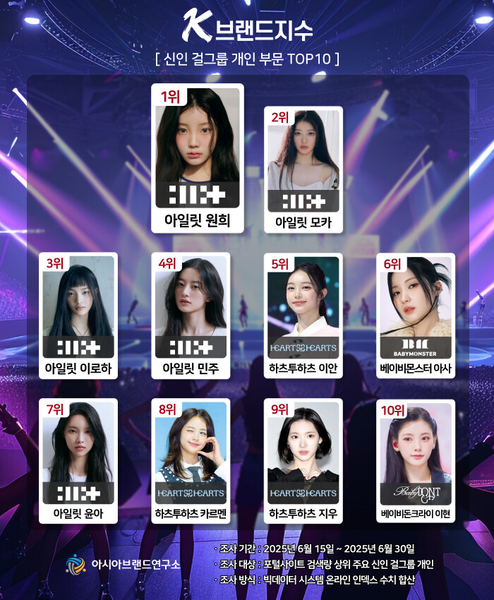 이번 K-브랜드지수 신인 걸그룹 개인 부문은 포털사이트 검색량 상위 주요 신인 걸그룹 개인을 대상으로, 2025년 6월 15일부터 6월 30일까지의 온라인 빅데이터 5796만 3685건을 분석하여 진행됐다.