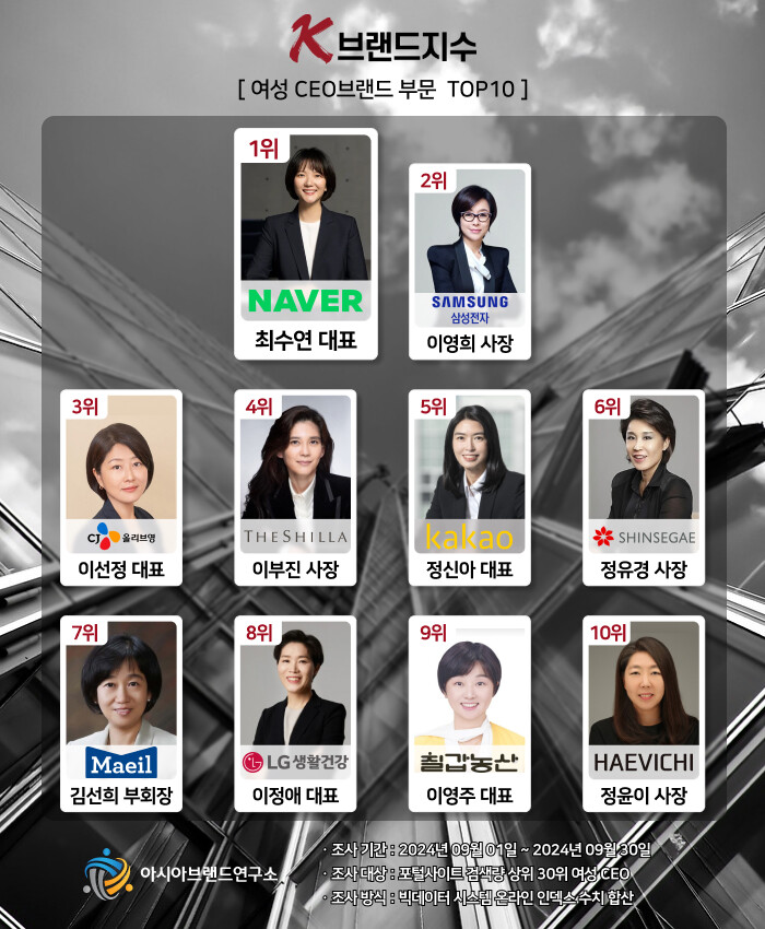 K-브랜드지수 여성 CEO 부문은 최수연(네이버 대표)이 1위에 등극한 가운데 이영희(삼성전자 사장), 이선정(CJ올리브영 대표), 이부진(호텔신라 사장), 정신아(카카오 대표), 정유경(신세계 사장), 김선희(매일유업 부회장), 이정애(LG생활건강 대표), 이영주(칠갑농산 대표), 정윤이(해비치호텔 사장) 등이 TOP10의 영예를 차지했다.