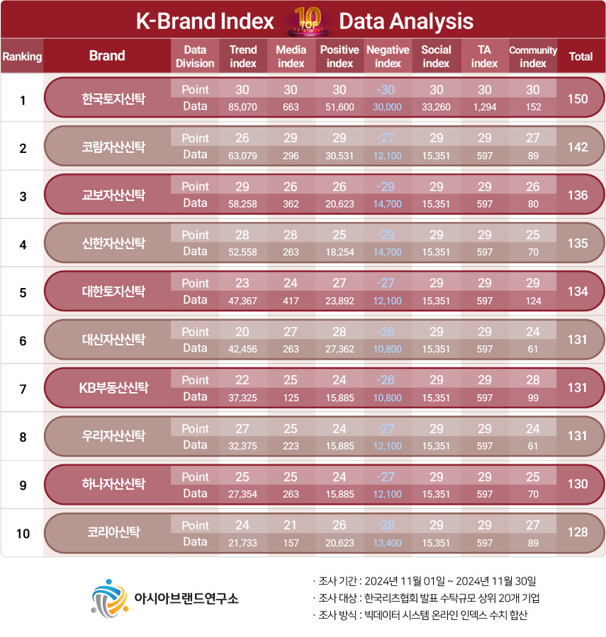 이번 K-브랜드지수 신탁사 부문은 한국리츠협회 기준 수탁규모 상위 20개 기업 브랜드를 대상으로, 2024년 11월 1일부터 11월 30일까지의 온라인 빅데이터 119만 4348건을 분석했다.