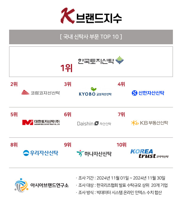‘K-브랜드지수’ 신탁사 부문은 1위 한국토지신탁에 이어 코람코자산신탁(2위), 교보자산신탁(3위), 신한자산신탁(4위), 대한토지신탁(5위), 대신자산신탁(6위), KB부동산신탁(7위), 우리자산신탁(8위), 하나자산신탁(9위), 코리아신탁(10위) 등이 TOP10의 영예를 안았다.