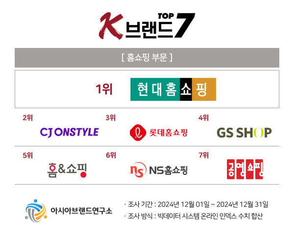 아시아브랜드연구소 - 아시아브랜드연구소, ‘K-브랜드 톱7’ 홈쇼핑 순위 발표...‘현대홈쇼핑′ 1위 영예
