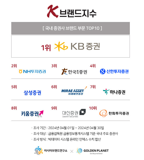 아시아브랜드연구소와 골든플래닛이 자체 개발한 빅데이터 시스템을 통해 산출된 증권사 부문은 2024년 4월 1일부터 30일까지의 온라인 빅데이터를 기반으로 분석했다.
