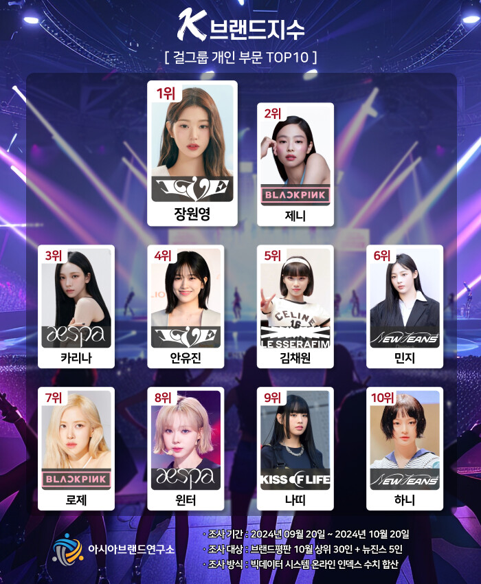K-브랜드지수 걸그룹 개인 부문은 아이브 장원영이 1위를 차지한 가운데 블랙핑크 제니(2위), 에스파 카리나(3위), 아이브 안유진(4위), 르세라핌 김채원(5위), 뉴진스 민지(6위), 블랙핑크 로제(7위), 에스파 윈터(8위), 키스오브라이프 나띠(9위), 뉴진스 하니(10위) 등이 TOP10의 영예를 안았다.
