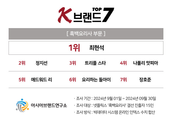특히, ‘K-브랜드 톱7’ 흑백요리사 부문은 2024년 9월 1일부터 30일까지의 온라인 빅데이터 5656만 1025건을 대상으로 진행됐다.