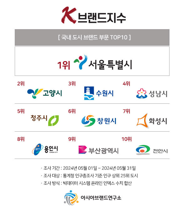 국가대표 브랜드를 표방하는 K-브랜드지수는 아시아브랜드연구소가 국내외 연구진과 협력해 개발한 빅데이터 시스템으로, 이를 기반으로 산출된 도시 부문은 2024년 5월 1일부터 31일까지의 핵심 온라인 빅데이터를 분석했다.