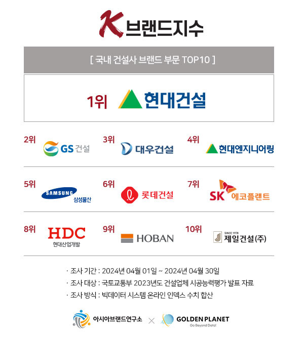 아시아브랜드연구소와 골든플래닛이 자체 개발한 빅데이터 시스템을 통해 산출된 건설사 부문은 2024년 4월 1일부터 30일까지의 온라인 빅데이터를 기반으로 분석했다.