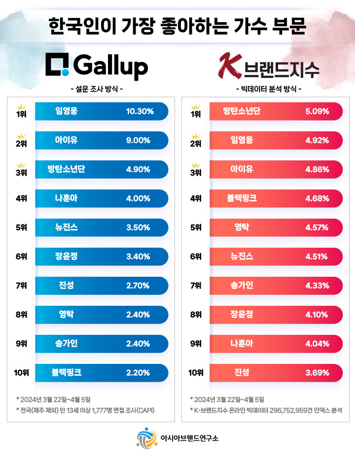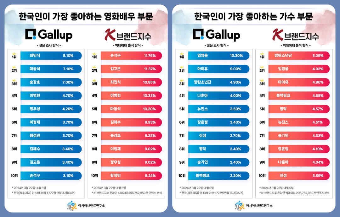 아시아브랜드연구소 한정근 대표는 "한국갤럽이 발표한 대중문화 각 부문별 선호도 설문 조사 결과의 의구심 해소 차원에서 본 연구소는 자체 개발한 K-브랜드지수 빅데이터 시스템을 통해 해당 선호도 순위의 재조사를 실시했다. 한국갤럽의 설문 조사와 동일한 기간으로 설정해 빅데이터를 분석한 결과 6개 부문 중 3개의 1위가 불일치했다“고 설명했다.